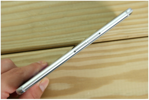 側邊為電源按鍵及音量鍵,厚度僅 7.38mm,對阿湯來說 5.5 吋左右手機厚度只要在 8mm 以下手感都非常的不錯,是很剛好的厚度,而且在四周還加上了內凹的金屬圓弧切邊,有別於一般現在很常見的鑽石切邊設計,其實阿湯覺得還蠻好看的。