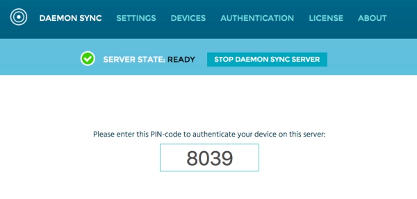 請點我,就會進到設定畫面,進入後這時先看一下 Server state 是不是 Ready,平常這會是常駐,不想用可以按下 Stop,而現在畫面上顯示的 PIN 密碼將他記下,等會要用在手機 APP 的驗證。