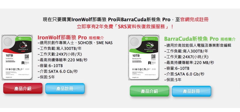 目前 Seagate 全新推出的守護者系列產品中,包括那嘶狼 Pro 與新梭魚 Pro 這二款系列產品都是免費隨硬碟附有 2 年 SRS 資料恢復救援服務,購買後只要到官網完成註冊,就會有2年「SRS資料恢復救援服務」,所以記得要去註冊哦。