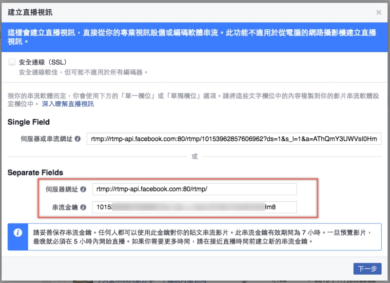 這時會跳出這畫面,你只要複製下方的伺服器網址(這不會變)以及串流金鑰欄位,然後點擊下一步,接下來要到 OBS 軟體上輸入我們記下的這二中
