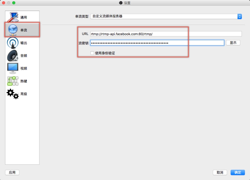 接換到串流,串流類型選擇「自定義」,URL 請填入剛剛在粉絲團取得的伺服器網址,流密鑰就是串流金鑰,請填入後按下確定。