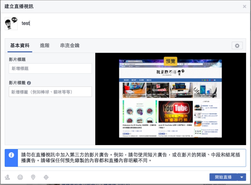 這時就會出現我們電腦所設定的畫面了,你就可以打好內容等,開始進行直播囉。