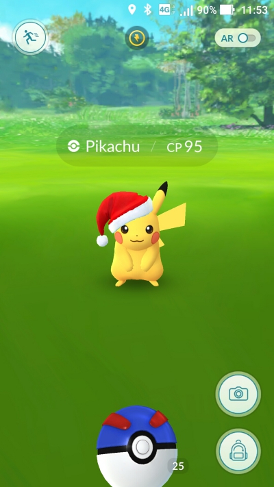 簡單的說就是從今天晚點開始(應該開始了吧!)一直到 12/29 PST 10:00 AM 為止,都有機會可以抓到像下圖帶著聖誕帽的皮卡丘出現在你面前,應該就是今年聖誕限定(明年搞不好一樣),但大家抓寶之於還是要注意安全啊!