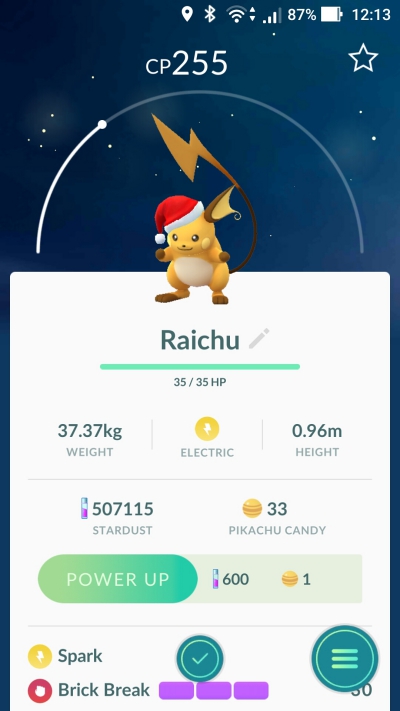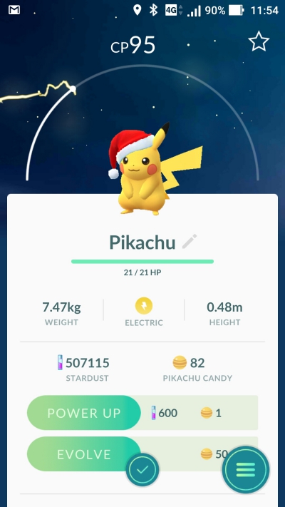 基本上這幾天遇到的皮卡丘應該通通都是帶耶誕帽的限定版,路上看到,Nearby 都會看到帽子,另外就是進化成雷丘後,帽子是不會消失的哦。