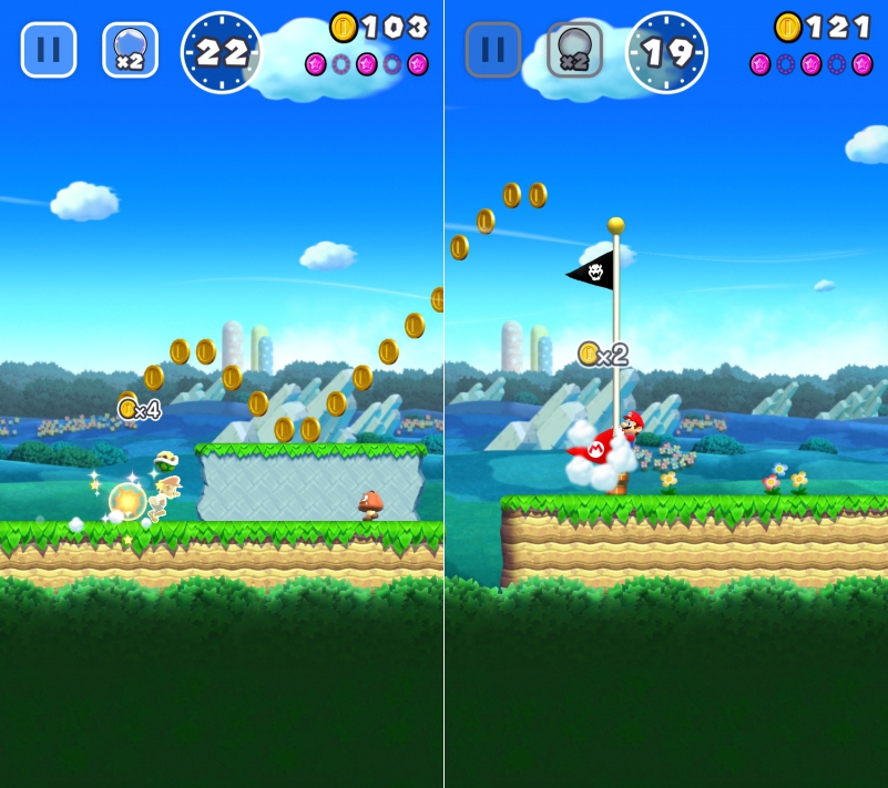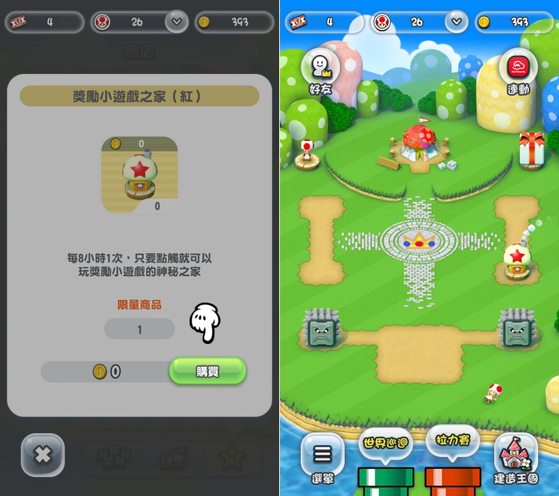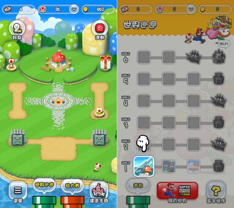 這款瑪莉歐跑酷遊戲目前有 6 個世界共 24 關卡,不過除此之外,遊戲的機制還包含建立王國,好友對戰機制(挑戰分數,非實時對戰)等,真的是比想像的多太多東西了。