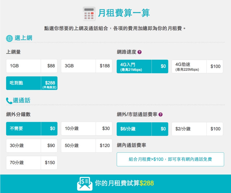 有這些選擇之下,大家會怎麼搭配?以阿湯這種用不到電話的網路重度使用者來說,當然就是直接選擇吃到飽(288 元)+4G 勁速(100 元)+不需要網外通話(0 元),每月只需 388 元就搞定,如果要再省一點就是選擇入門網路速度(0 元),那麼每個月吃到飽就只需要 288 元而已啊。