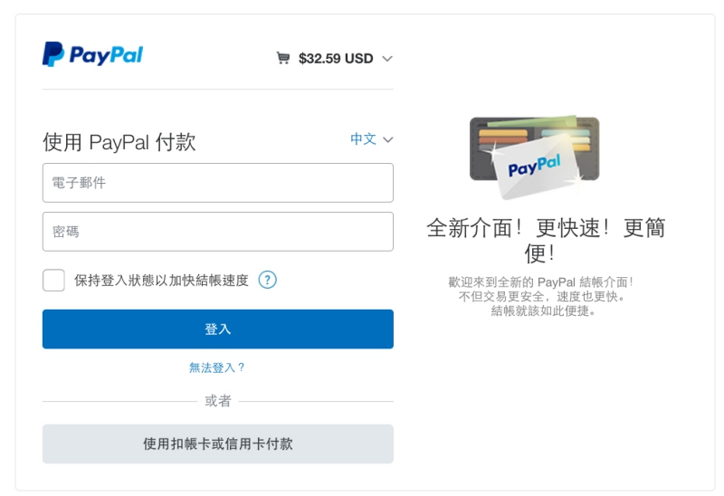 結帳是結合 Paypal,不過沒有 Paypal 帳號也沒關係,一樣可以直接透過信用卡結帳,選下面的「使用扣帳卡或信用卡付款」。