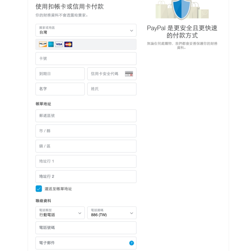 接下來就輸入你的信用卡相關資訊,進入結帳,要注意的是,寄送地址也是在這一個頁面填寫,如果你帳單地址跟寄件地址是不同的話,記得要取消勾選運送至帳單地址,然後輸入要寄送的資訊。