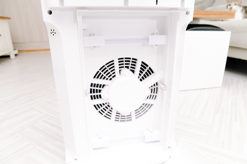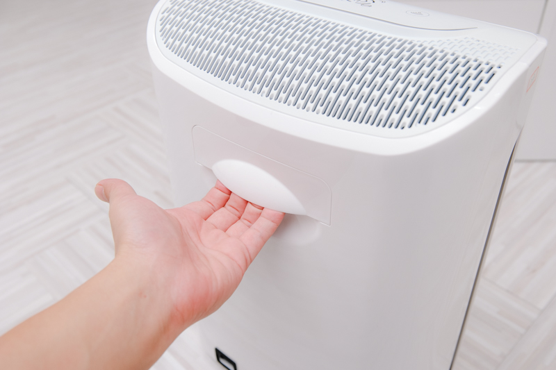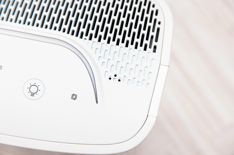 我們先從機身來看看,正上方是出風口,過濾後的空氣都是從上方出來的,而二側有二個四孔三角形,右側為 VOC(揮發性有機物)偵測器,隨時都可以透過手機 APP 來查看這些數值。