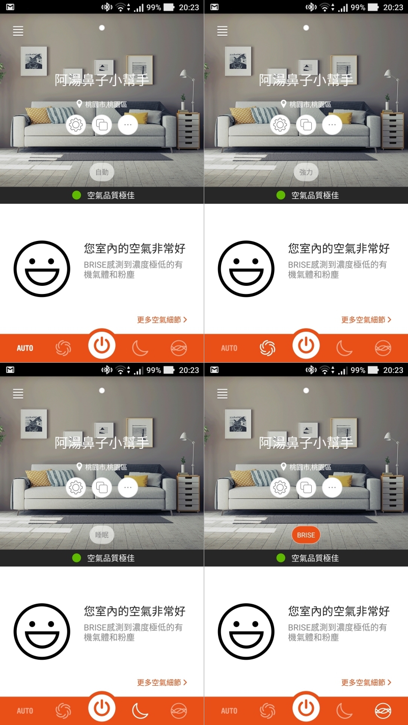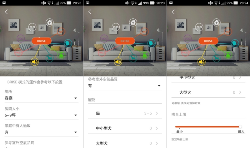 BRISE 模式下,可以設定的包括客廳、房間大小、有沒有過敏、是否參考戶外空氣品質、有沒有養寵物(狗還區分大中小),另外也能設定噪音上限,讓空淨機維持在一定程度的運轉之下,就不會覺得有個轟轟轟的聲音在一旁。