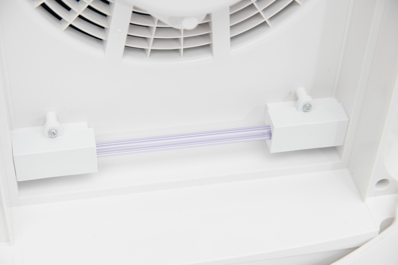 除了濾網本身就已經能夠去除 PM 2.5 及 VOC 之外,上下分別各有一個紫外燈,加上 TiO2 濾網的光觸媒作用,能有效破壞各種有機體的結構,進而加強除菌、除有害氣體的威脅。