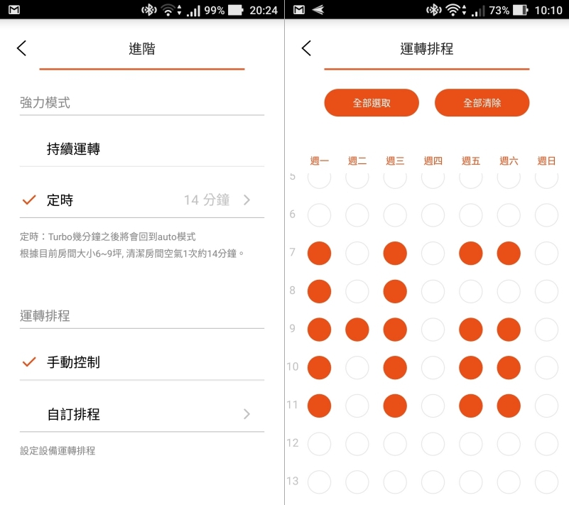 對於上班族來說,可能在上班時間家中並沒有半個人在,這時你就可以透過設定運轉排程來節省電力消耗,比如你上班如果是一到五,就可以設定六日一整天,上班日則是設定在你抵達家中的前一小時開啟,這樣一來每天一回到家空氣都是乾乾淨淨的等著你呼吸。