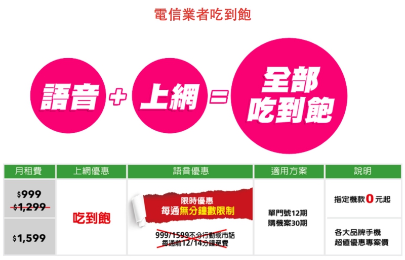 這新推出的全部吃到飽方案,目前分為 999 及 1599 兩種資費,其中 999 元更是限時優惠(原價 1,299 元),而原本這二個方案是有網外/市話每通前 12 及 14 分鐘免費的限制,新的限時優惠方案則是取消了這個限制,講電話就不再需要注意時間,上網則是原本就是吃到飽,非常的划算。