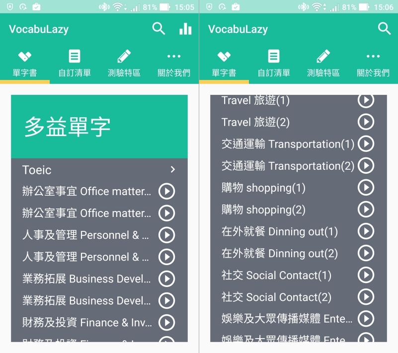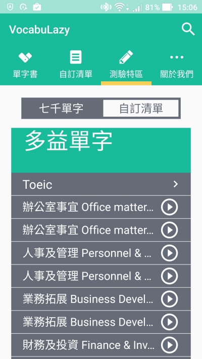以多益單字為例,會幫你分類好各種類型的單字,方便選擇。