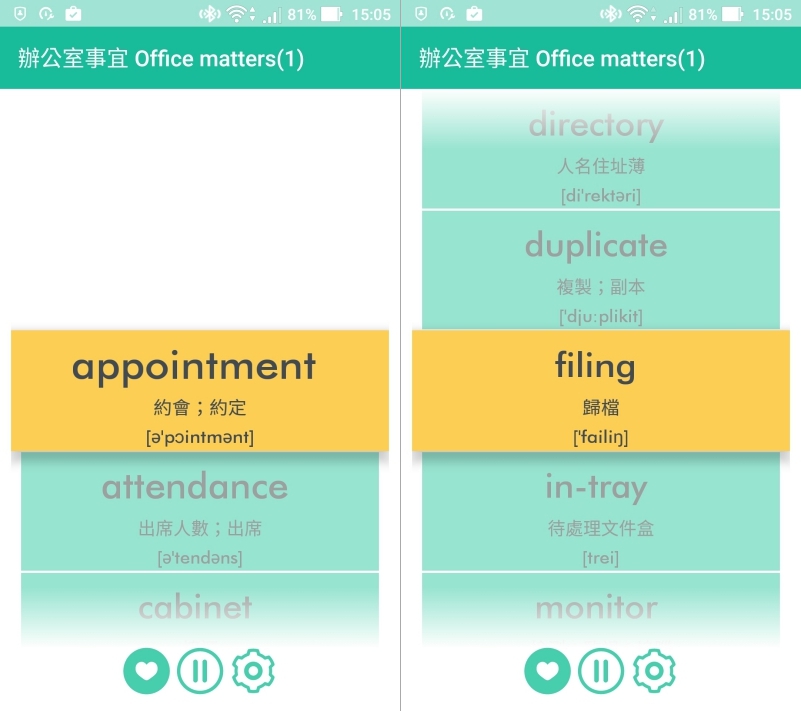 背的方式主要是像這樣,可以一個個往下滑,預設每滑一個單字都會發音一次,你可以跟著唸再搭配音標,只要你夠熟音標,其實只要會唸就大概都拼的出來。