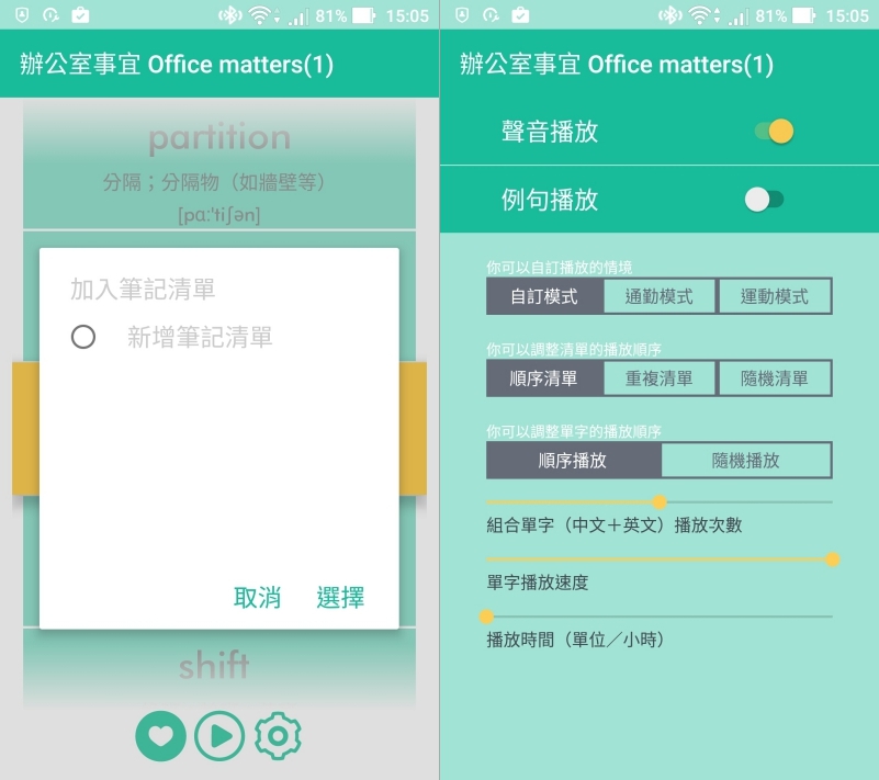 你也可將較背不起來的單字加入筆記清單,事後再拿出來反複練習,而背單字的設定也可以依自己的需求來進行設定。