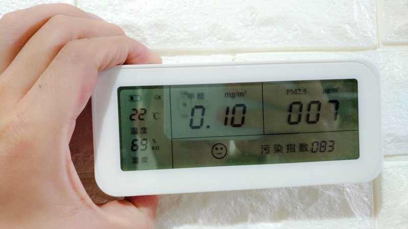 昨天在分享的時候就有人提到大陸的壁貼他都買到含甲醛,我買這家是主打零甲醛啦,當然我們不能聽信片面之詞,阿湯也實際測試了,家裡的家具本來就在空氣釋放 0.10 mg/m3 量出來,我拿到壁貼旁測了一陣子,一樣是 0.1,所以大家不用擔心甲醛的問題,實際也真的沒有聞到任何味道。