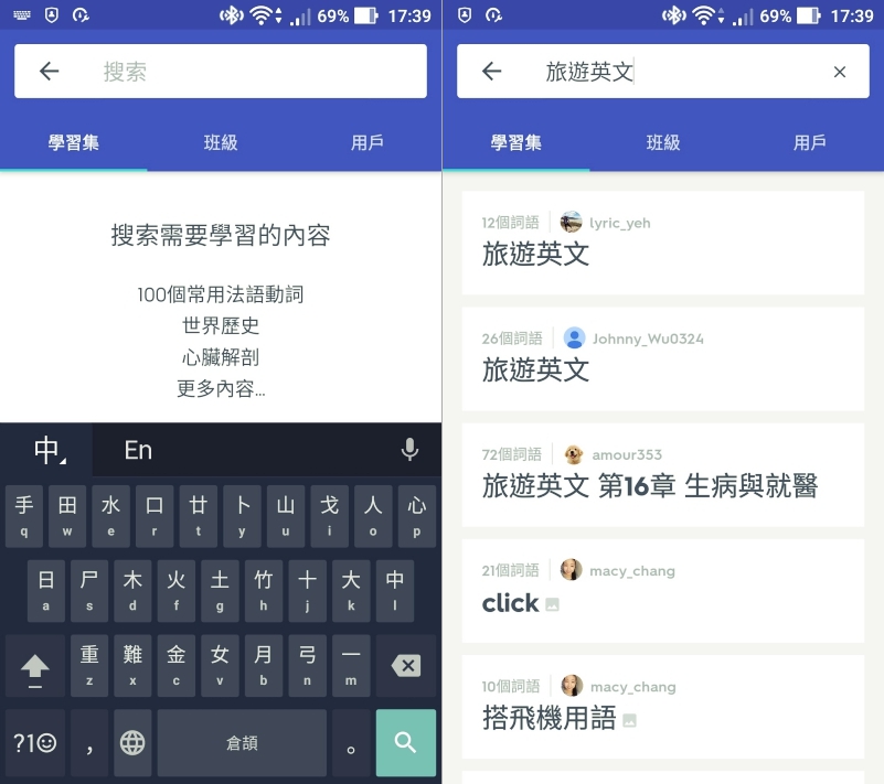 比如我透過搜尋,找「旅遊英文」,就會看到其他人所建立分享的學習可以直接閱讀使用。