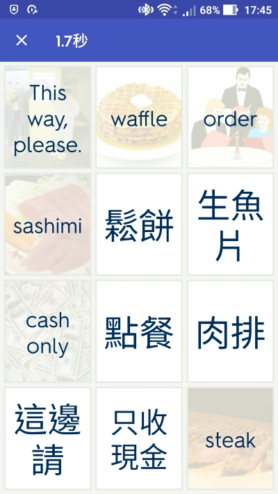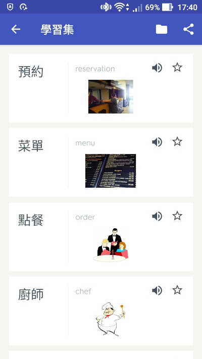 學習集就像這樣,一個一個網下,有些還有圖示,對於記憶更加的方便,而發音的部份是自動的,不是個人錄製,所以不會有發音不準的問題。