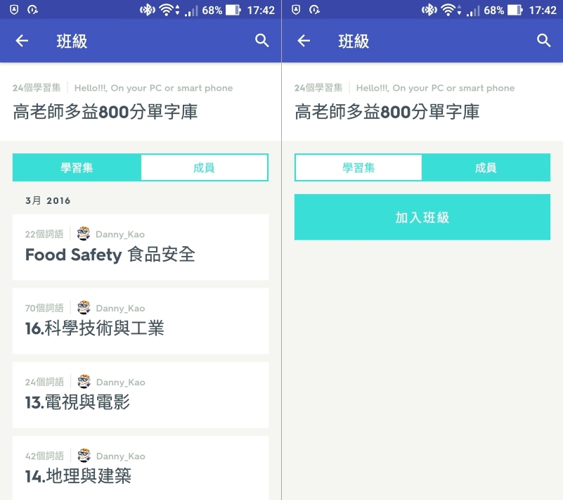 另外有個班級制度,這個蠻有趣的,可以由一個主成員來開啟班級,建立各種學習集之後,再由成員來加入,而且是採審核制,你點擊加入班級後,必須由對方同意才會加到這個班級裡,查看各種內容。