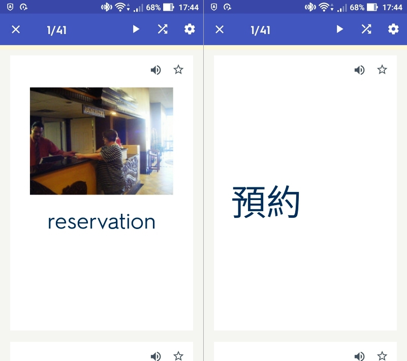 而字卡的學習方式像這樣,先顯示譯文後,點擊會顯示原文及圖片(看有沒有加入),以及可以聽發音和加入星號(書籤的意思)。