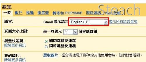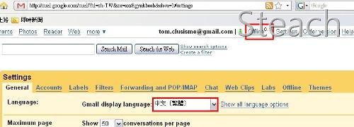 何謂離線版本? 比如說像是hinet的用戶,信箱是有提供pop3的收發功能,讓你能夠使用outlook類的軟體,將信件下載來電腦觀看,這就是離線觀看,原本的gmail只能侷限於上網時收發信件觀看,現在我們的google大神創造了離線版,讓你信件也可以下載在電腦裡觀看囉!這樣更方便了常使用筆電的用戶,隨時帶著趴趴照。 信件也可以利用離線版先行撰寫,等待連線後再寄送哦!真是方便如此一來沒網路的時候,你也可以看信寫信打發時間啦。那麼站長趕緊教你如何使用吧!! 1.登入gmail後先將介面轉換成英文 (只有英文版能用嗎?當然不是,不過為了啟用只能在英文介面中啟用啦!啟用完再轉回中文唄)