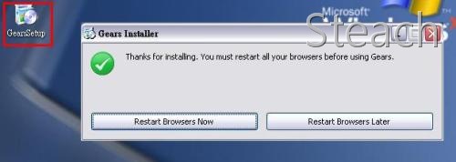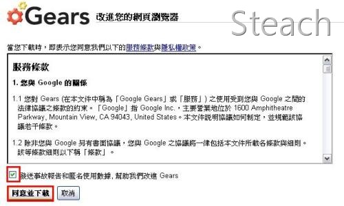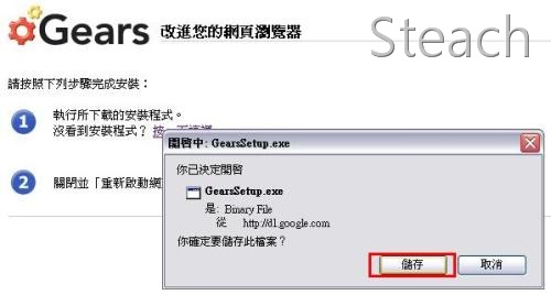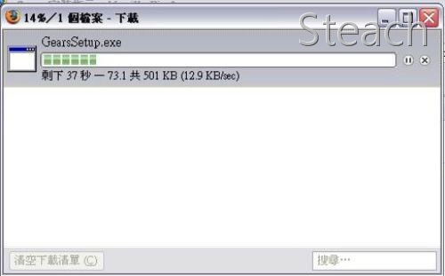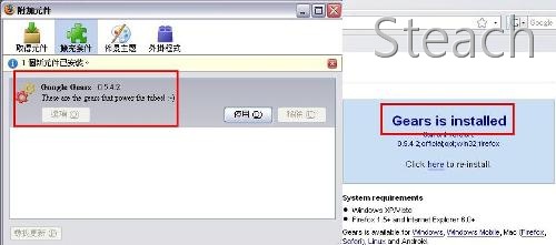 6.如下圖,點選安裝Gears,點選同意下載,下載後安裝完畢,重啟瀏覽器, 重開瀏覽器時就會看到Gears已經安裝完畢囉。
