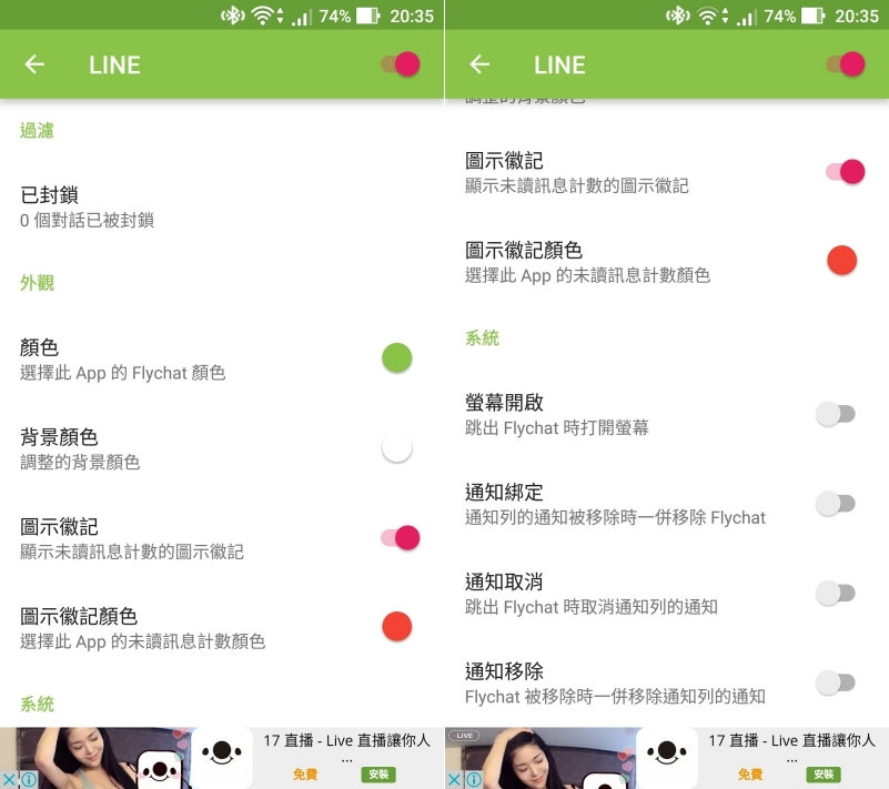 每個 APP 都可以設定不同的氣泡顏色、背景、圖示色彩等,另外像是可以開啟通知取消以及通知移除,這樣在你讀取使用後,才不會通知欄同時還存在訊息通知(依自己需求選擇)。