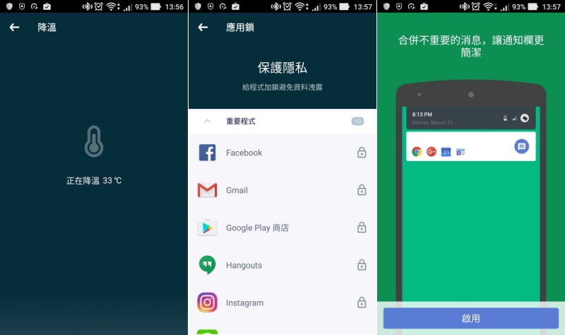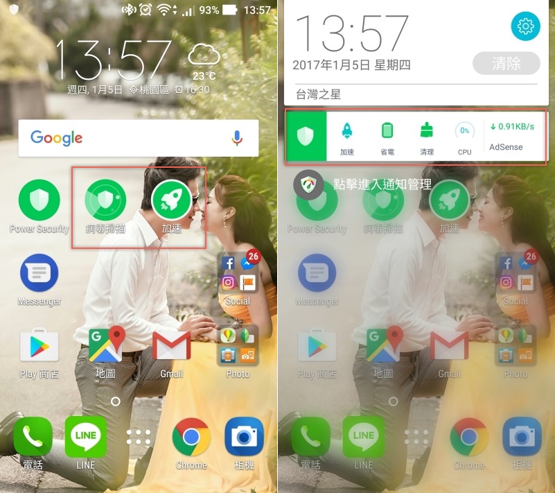 另外,安裝完後,在桌面及通知欄都會看到這樣的相關功能按鍵,在桌面按一下病毒掃描或加速就會直接執行,通知欄中的則是可以直接點擊執行或是查看 CPU 使用率以及目前正在使用網路的 APP 等,就能知道什麼 APP 正在背景更新或動作了。