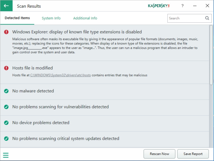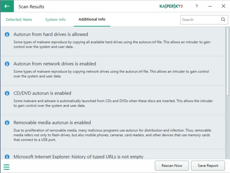 最後一項附加資訊(Additional Info)裡則是可以查看你目前電腦的相關安全性設定都是怎麼設定的,每個設定下也都有簡單的說明,別小看這些簡單的設定項目,有時電腦中毒就是因為這些原因造成的。