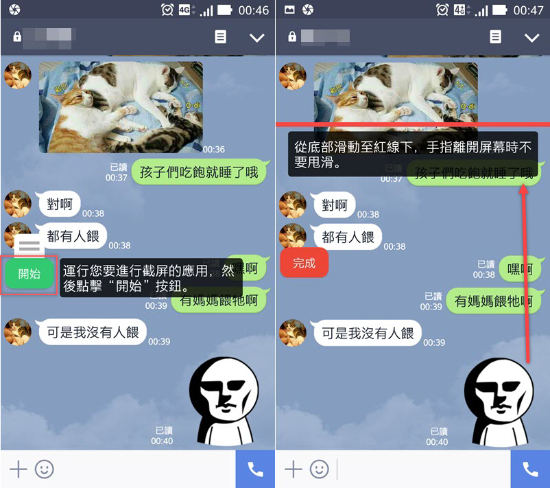 運行要截圖的應用程式,你可以開啟 Line 的對話頁面,點擊開始就會看到一條紅線,依照指示從要截取的底部(終點)往上滑,過程中 LongShot 會以震動來表示已截取一頁,就一直滑到截取頁面的起點。