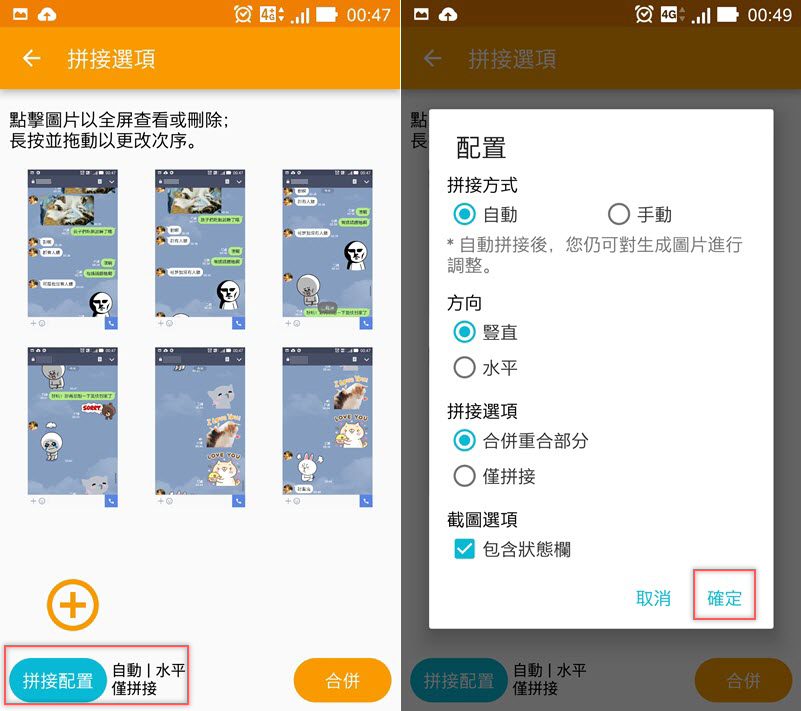 左下角點開「拼接配置」,可自由選擇想要怎樣的方式來產生圖片,確認後開始合併。