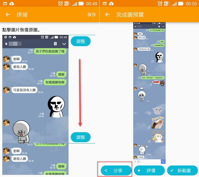 產出後可以調整截圖的邊緣,這個對 Line 還蠻實用的,不會切割或重複到對話框,調整完按保存就完成了,可以分享囉。