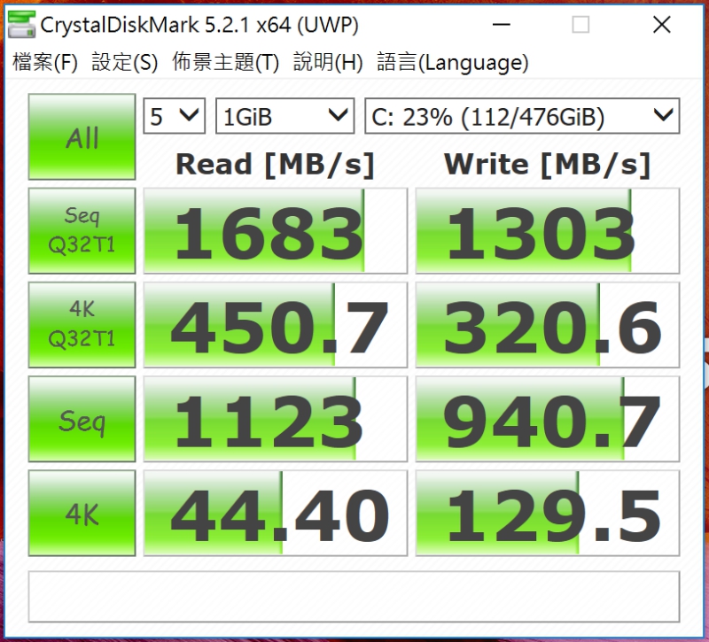 而 SSD 的讀寫速度非常的不錯,基本的讀取速度最高達 1683MB/s,寫入也達到 1303MB/s。