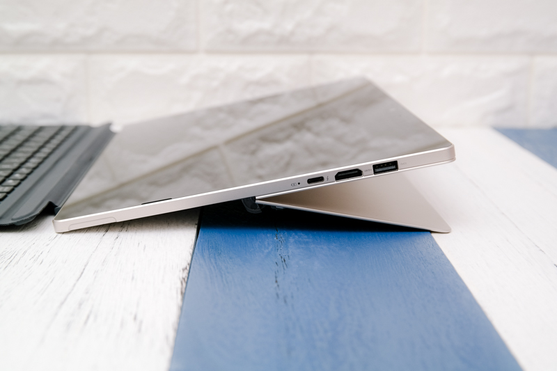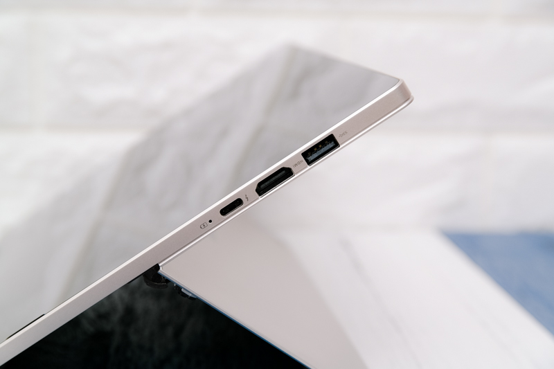 雖然輕薄,但和一般輕薄筆電有所差異的是,在 I/O 擴充上並沒有過於犧牲,在機身右側為 USB 3.0、HDMI(支援 4K 輸出)、支援 Thunderbolt 3 的 USB Type C(同時也是充電孔)。