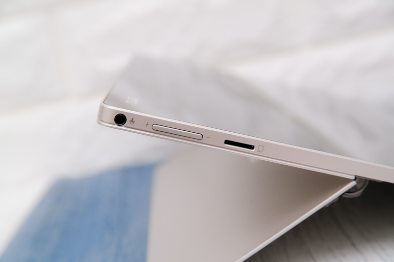 機身左側為耳麥音源孔、音量鍵以及 microSD 卡槽。