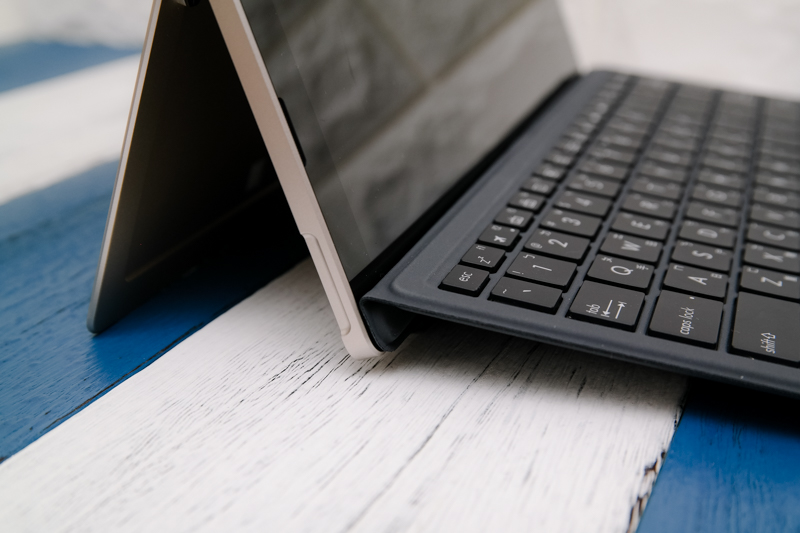 而鍵盤保護套的部份,為了增加手放置在鍵盤的舒適感,除了平放鍵盤之外,也可以往螢幕吸附墊高,更符合人體工學的使用。
