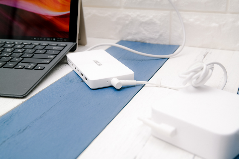 另外當 USB Type-C 被 Universal Dock 佔用後如果需要同時充電,只需要在 Universal Dock 側邊接上充電變壓器即可,這樣就能同時擴充也能充電。