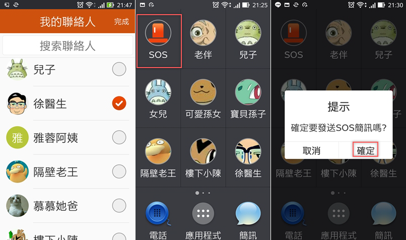重點就是在左上角的 SOS 功能,選取要發送給求助簡訊的聯絡人,目前只能設定一位。之後有突發狀況,就點擊 SOS 圖標,確定發送訊息。