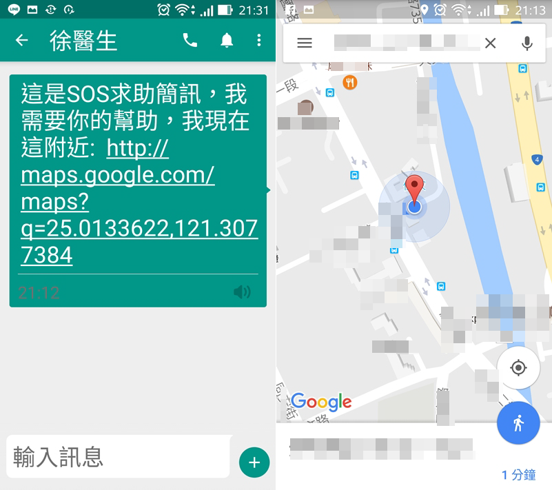 簡訊內容會附上所在位置,記得手機要開啟 WIFI 以便及時定位。
