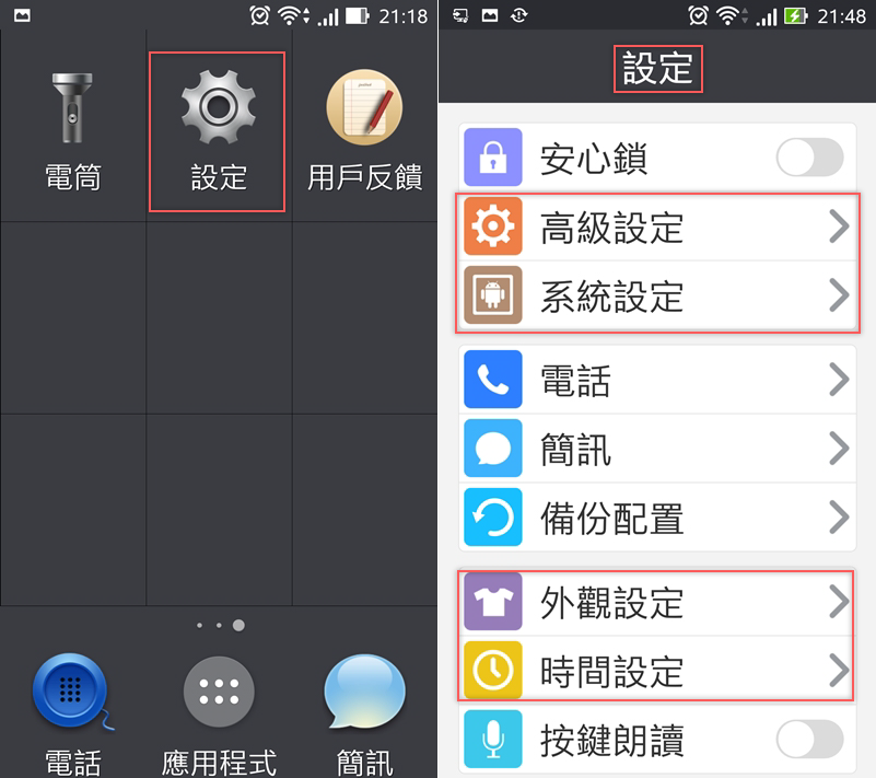 主螢幕往右滑的畫面預設是手電筒、設定、用戶反饋,當然這都可以更改。我們點入設定可以發現,它是以不同類別的設定為大分類,一層一層來找到想要的目標,比起一般眼花撩亂的介面更加人性化。