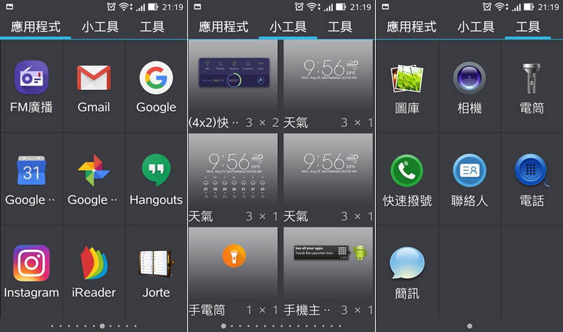 應用程式、小工具、工具頁面也是一格一格十分清晰,便於拖入想要的配置。大家可以先詢問長輩的需求,順手幫他們設定完成。