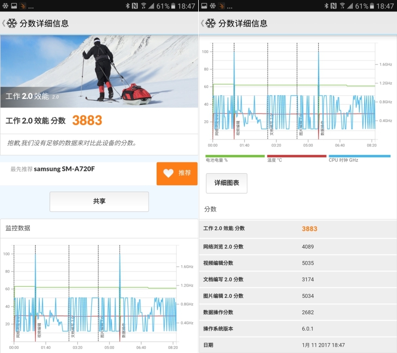 在安兔兔的部份獲得 60718 分,以中階手機來說算是表現不錯,但重點還是阿湯常提到的,跑分僅供參考,主要還是要看系統調校的好不好,否則分數再高都沒有用,所以還是要跟大家說 Galaxy A7(2017)很順暢。