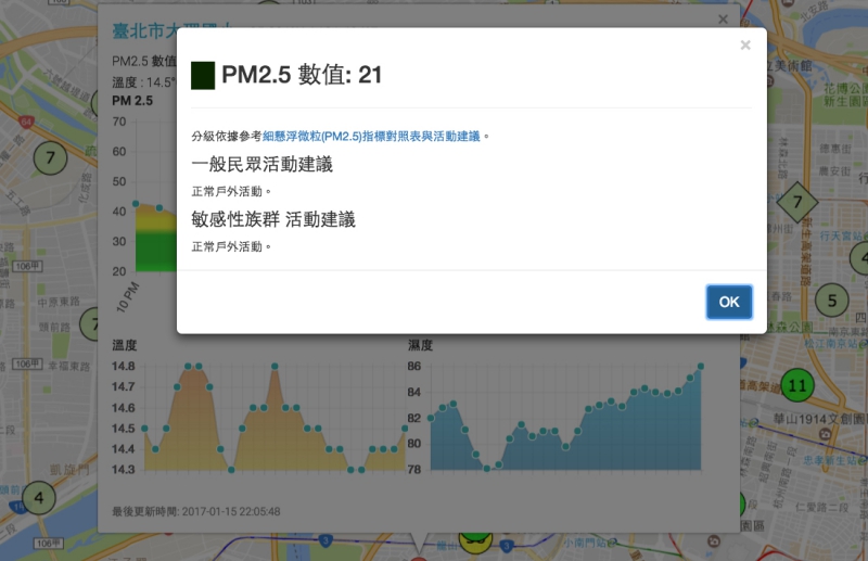 進入網站後直接就可以看到全台各地的空氣品質狀況,綠色基本上都是沒問題的,看到紅紅紫紫的就要擔心了,原則上空氣品質的 PM 2.5 最後要低於 35 以下比較好。