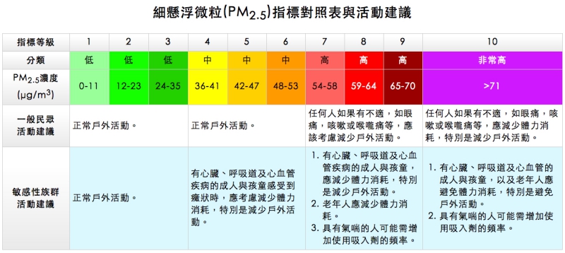 如果大家還是對 PM 2.5 濃度的數據不太理解,就看一下對照表,就知道在什麼樣的狀況下出門比較需要戴口罩,而口罩記得也要買可以過濾 PM 2.5 的,一般口罩只能防風沙,對於這些細懸浮微粒是沒有幫助的。