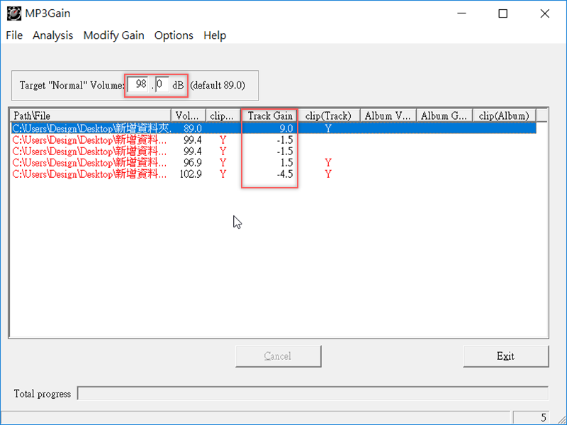 分析的結果出爐,阿湯這邊設的音量標準化大小為 98dB (預設是 89dB 可自行調整),果然檔案之間的音量差異有點大,可以看到音軌增益的那排數字從 -4.5 到 9 之間都有,難怪耳朵受不了。