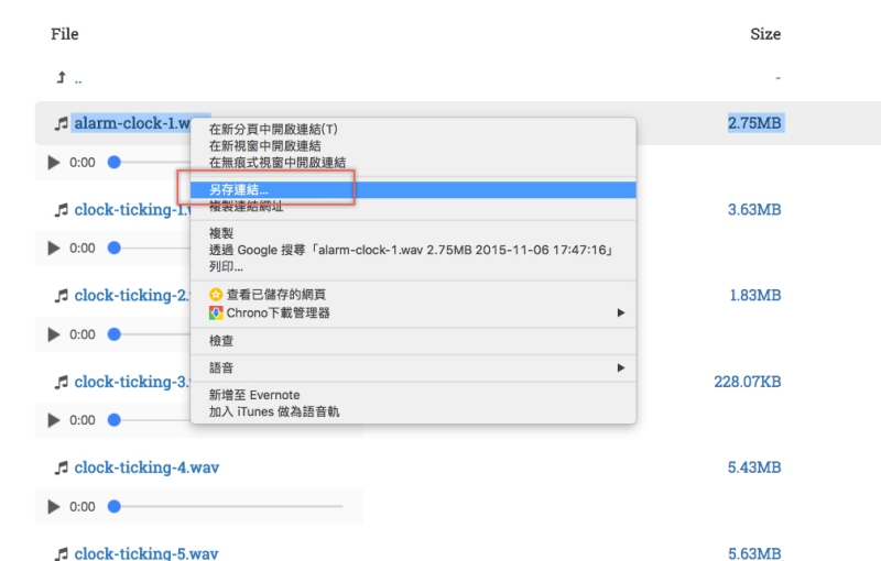 如果想針對單一個音效下載,只需要在音效的右鍵直接另存連結或檔案就可以囉。