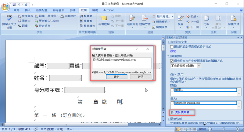 通常像這種文件都要給主管過目更改,我們只要在例外選項中點選「更多使用者」,輸入使用者名稱,如果不只一人就以分號分隔。