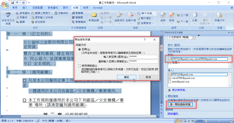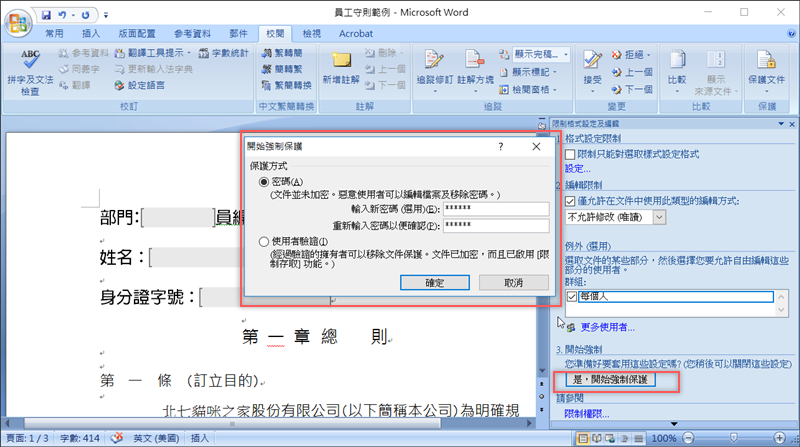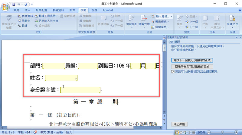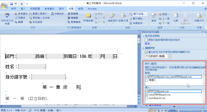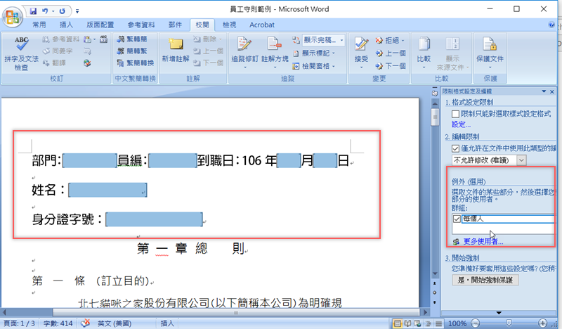 以前工作時常常碰到把一份 Word 文件放在公司雲端給大家填寫,但很容易發生每個人填寫格式不同而造成傳回來的檔案內容亂七八糟不一致,原本制式的內容也容易被動到(無論是不小心還是故意),其實只要在文件發出去之前先啟動文件保護,限制大家可以更改的區域,就可以避免這個問題,同時也可以將修改權指定給特定人士(例如主管),這樣做之後相信文件內容就會整齊多了。