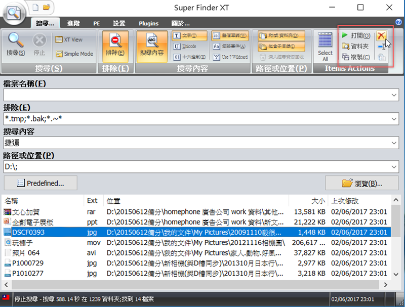 阿湯以搜尋文字內容為例,不記得檔案名稱,只記得內容有「捷運」兩個字,位置應該在 D 槽,開始搜尋,結果跑出了十五個檔案,但是除了紅框之外,下面的 jpg 、 mov 、 avi 檔內容都沒有「捷運」啊,不知道為什麼會跑出來。